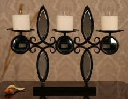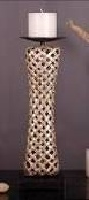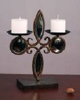| | BESCHRIJVING | Kaarshouder | | MATERIAAL | Metaal + Glas | | AFMETINGEN | 20" x 15"(H) | | GEWICHT CA. | 2.27 kg | | AFWERKING | poeder coated ijzer in | | | antiek goud/koper/ zilver - metallic afwerking met ingelegd spiegelglas | | Bestelnummer: CANHO01 |